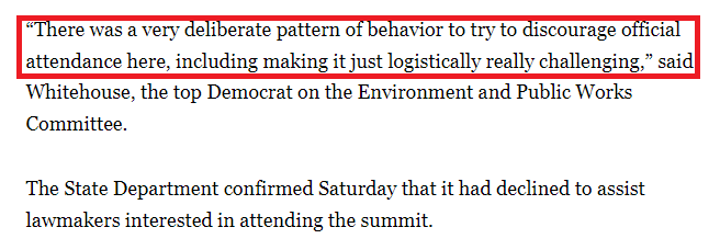 《联合国气候变化框架公约》第30届缔约方大会(COP30)将在巴西贝伦举行。本次会议重点讨论了一些重要的气候问题,呼吁世界各国共同努力,寻找应对气候危机的共同解决方案。来自全球190多个国家和地区的政府代表、国际组织代表、科学家、企业家齐聚巴西。然而与国际社会相反的是,美国政府不仅派出高级官员出席会议,还禁止国会议员出席会议。 Politico近期文章称,美国民主党参议员谢尔登·怀特豪斯本周接受采访时表示,美国国务院正在阻止美国官员参加联合国气候会议。白宫称美国破纪录“停摆”美国政府是前往伯利恒参加会议的主要障碍,但这并不是唯一的障碍。他告诉记者,美国国务院拒绝帮他申请参加COP30的文件——这与国务院以往的做法完全不同。他说:“有些人故意阻止官方人员参加会议,包括在后勤保障方面制造很多困难。” Politico News截图报道,美国国务院15日承认,拒绝帮助想要参加COP30的国会议员。美国国务院发言人在给Politico的电子邮件中表示:“美国政府拒绝使用纳税人的钱来资助或协助任何参加COP30的官员的旅行。这次会议的目的是削弱美国经济,让美国人民破产。”民主党参议员谢尔顿·怀特豪斯 (Sheldon Whitehouse)Politico新闻网报道的截图)还在文章中表示,COP30将在美国政府加倍加大化石燃料开采力度之际举行,美国将在几个月内第二次正式退出《巴黎协定》。对此,怀特豪斯在巴西贝伦逗留期间多次向其他代表强调,美国政府对化石燃料的积极态度并不代表整个美国。文章透露,美国一些人士认为,美国并未派出高级别代表团参加COP30。这表明,在当前讨论气候变化问题的关键时期,美国缺乏推动谈判取得进展的经验和能力。美国民主党参议员怀特豪斯也承认,美国政府对COP30的冷落损害了怀特豪斯的全部se在会议上的努力。政治新闻网截图报道 怀特豪斯表示,从长远来看,他希望美国能够以合作伙伴的身份重返全球舞台,并弥补前景造成的损害。他表示,如果美国明明拥有最好的科学技术和资源来应对气候变化,却仍然退出《巴黎协定》并积极支持化石燃料,这些行为将在未来一段时间内损害其声誉——特别是在全球气候变化引发的山火、热浪、飓风和台风等灾害加剧的情况下。 “我们越早做出正确的决定越好,”他说。与此同时,白宫也不羞于批评美国民主党解决气候问题的无效做法。文章称,在 COP30 美国境外的一次活动中,白宫表示,在美国民主党执政期间,美国民主党在气候问题上表现“懦弱”,常常满足于“不成熟的措施”。他承认,“你必须证明,当你拥有政治权力时,你会积极而巧妙地使用它,并且你愿意大胆行动。不幸的是,在气候问题上,我们无法做到这一点。”