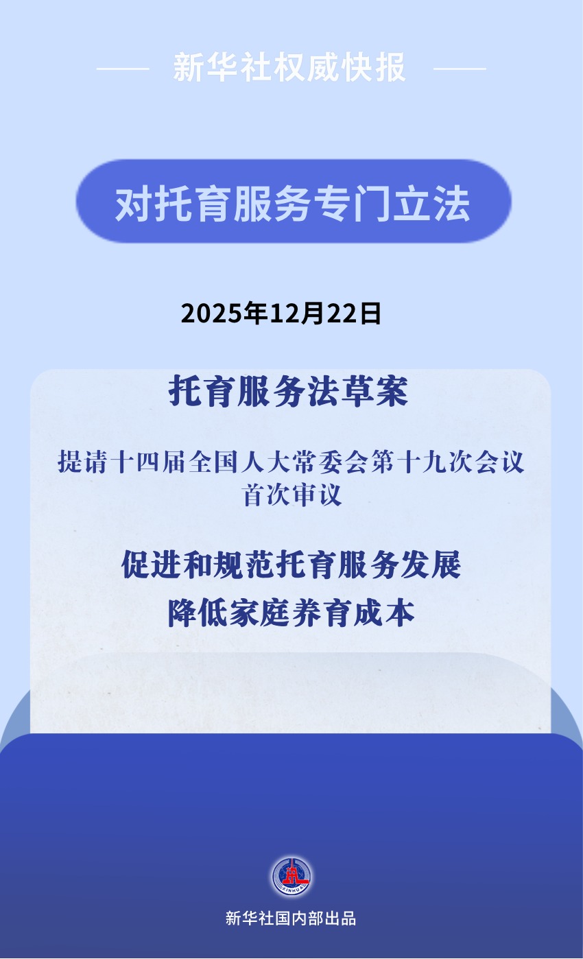 12月22日,托儿服务法草案提请第十四届全国人大常委会第十九次会议第一次审议。草案共8章76条,包括总则、托育机构、托育人员、服务提供、防范措施、监督管理、法律责任和附加规定等。制定托儿服务法,促进和规范托儿服务发展,为最弱势的婴幼儿和三岁以下儿童提供强有力的法律保护,是完善生育支持政策、降低家庭养育成本、提高人口素质的重要举措。这对于建设生育友好型社会、推动人口高质量发展具有重要意义。